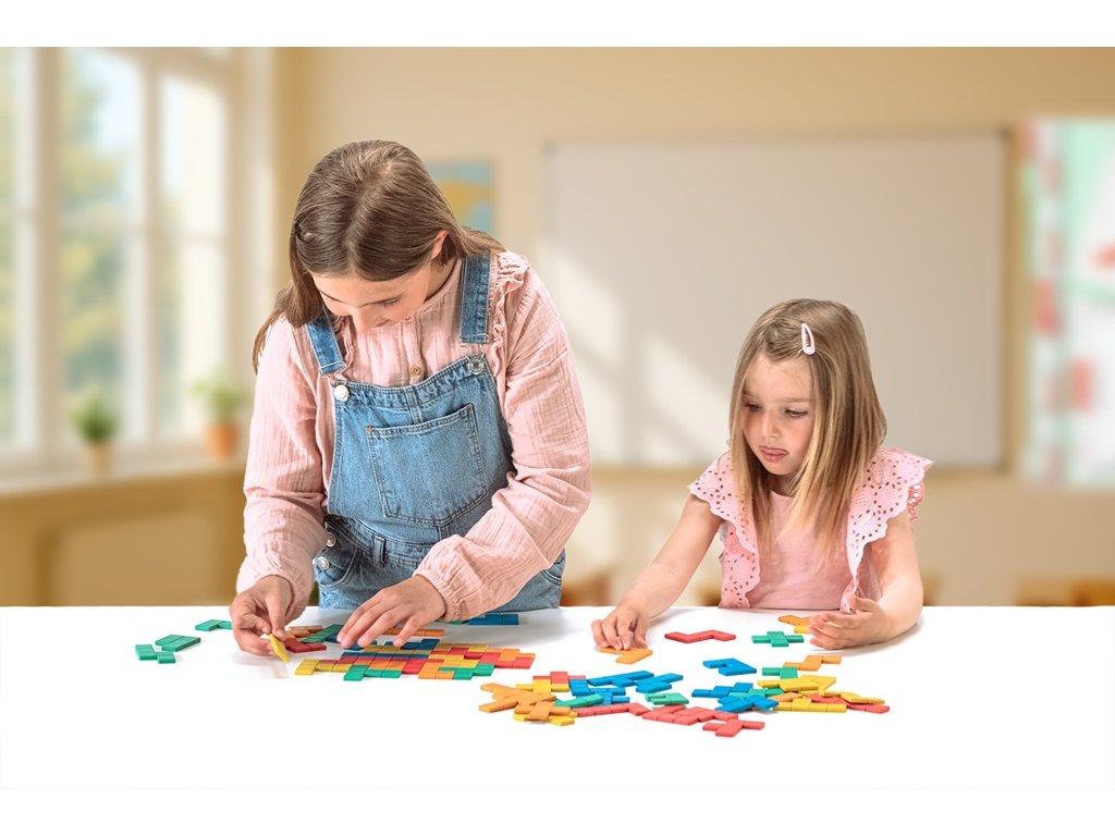Pomocí 60 ks pentomin v 5 barvách (12 pentomin od každé barvy) si děti mohou poskládat různé obrázky dle vlastní fantazie nebo vyplňovat obrázky, kde je vyznačen pouze obrys. Prostřednictvím hry získají první zkušenosti s geometrií, zjistí, co je plocha a obvod, které útvary jsou symetrické a které ne. Pentomina jsou vyrobena z recyklovaného dřeva v pestrých barvách – červené, zelené, modré, oranžové a žluté. Vyrobeno z pevného 100% recyklovaného dřeva s certifikací PEFC, které je po použití opakovaně recyklovatelné, a zabaleno v kartonové krabičce. Hlavní vlastnosti: 60 ks pentomin v pěti barváchseznámení s geometrií prostřednictvím hryvyrobeno ze 100% recyklovaného dřeva s certifikací PEFCvyrobeno v Německu