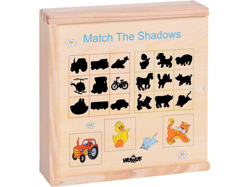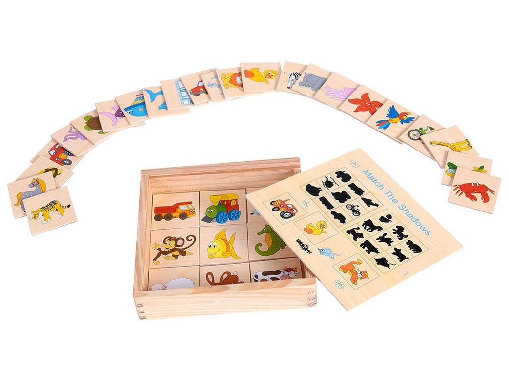 Dětská dřevěná doplňovačka obrázků na políčko s jejich stínem ze dřeva, vhodné pro nejmenší děti.Dítě přiřazuje destičky s barevnými obrázky k jejich černým siluetám. Vše je zabaleno v praktické dřevěné krabičce. Stínové puzzle "přiřaď, co kam patří".
