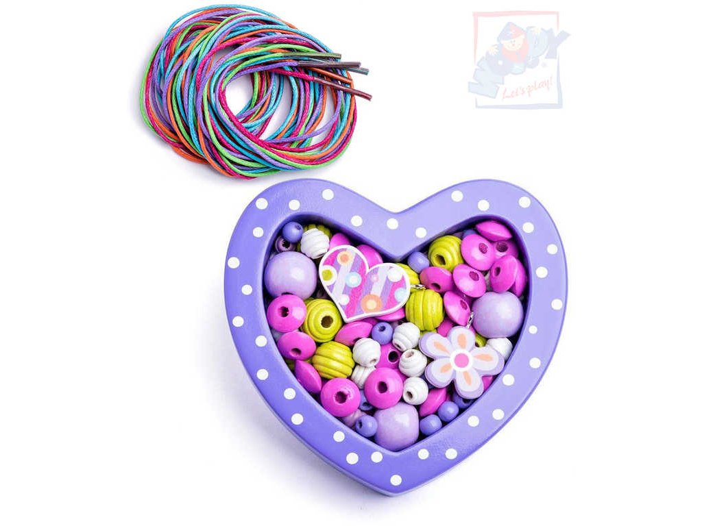 Sada obsahuje velké množství dřevěných korálků různých tvarů a tenké tkanice s koncovkou k provlékání. Vhodné pro rozvoj jemné motoriky. Baleno v dřevěné krabičce ve tvaru srdíčka.