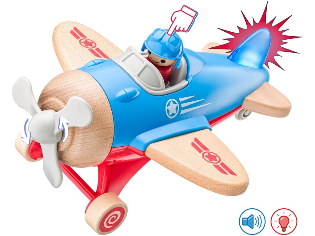 WOODY DŘEVO Letadlo baby s pilotem na baterie Světlo Zvuk