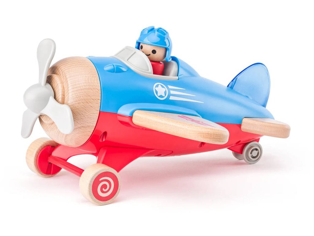Woody jednoduché dřevěné letadlo s pilotem, pro nejmenší děti. Zaoblené hrany, vyrobeno ze dřeva a plastu. Hračka na baterie, se světlem a zvukem. Zmáčknutím figurky pilota se aktivuje světlo a zvuk.