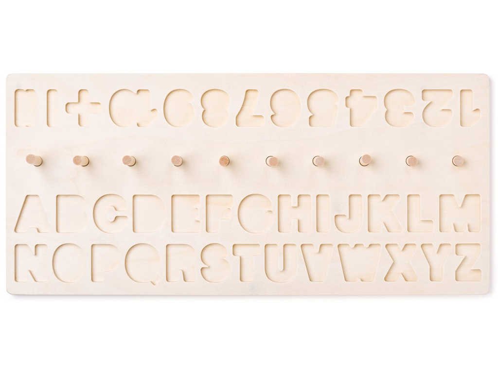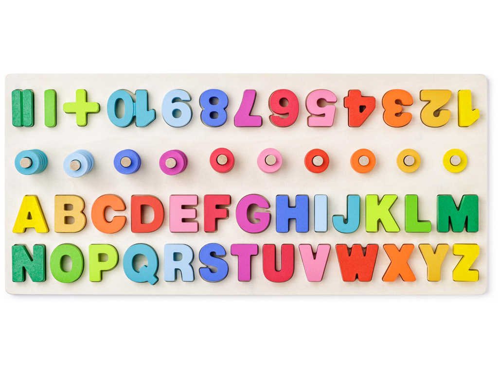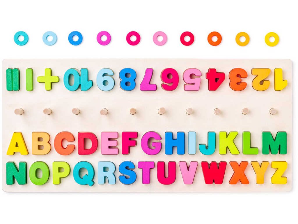 Naučná dřevěná hra s barevnými vkládacími číslicemi a písmenky a s navlékacími kroužky. Vkládačka & navlékačka. Didaktická destička s počítáním, písmeny a číslicemi. Hračka s kterou se dítě naučí