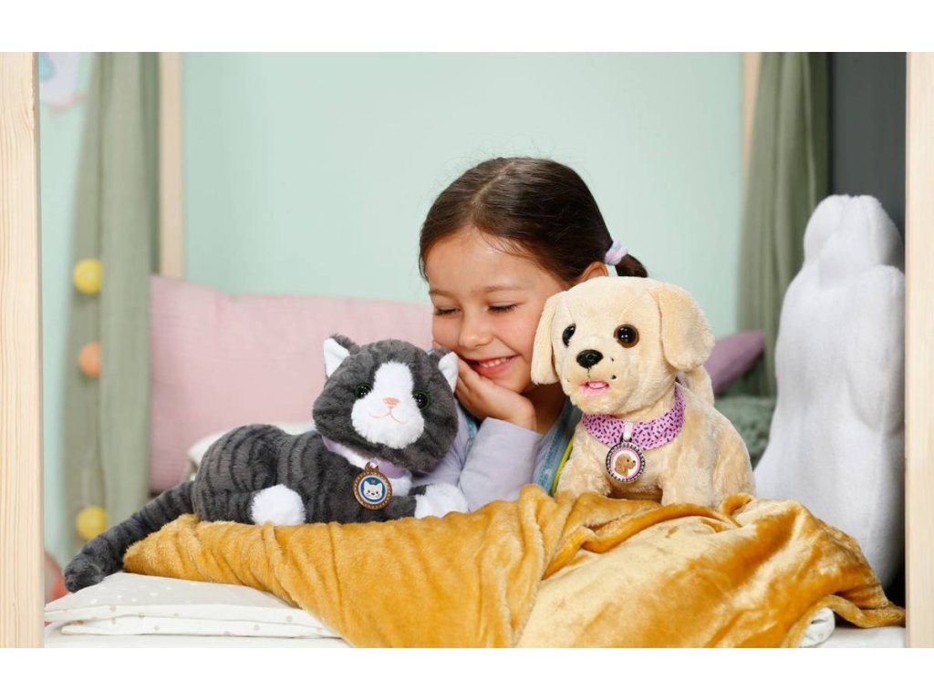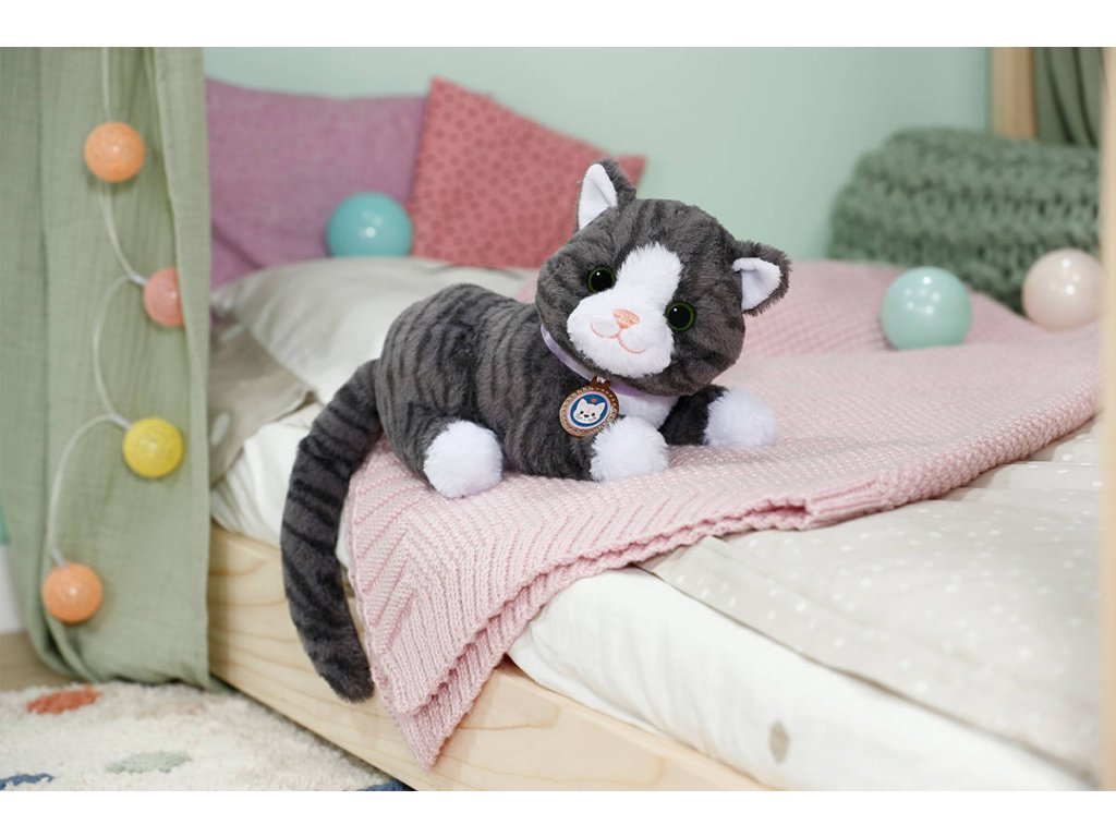 Plyšová kočička Cookie, interaktivní zvířátko z kolekce Baby Born od Zapf Creation. Reaguje na dotek, přede - vrní (vibruje), součástí přepravní box / pelíšek 2v1. Hračka na baterie se zvukem.