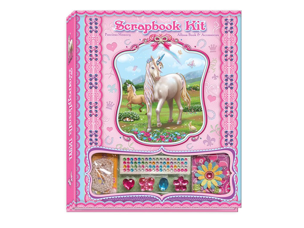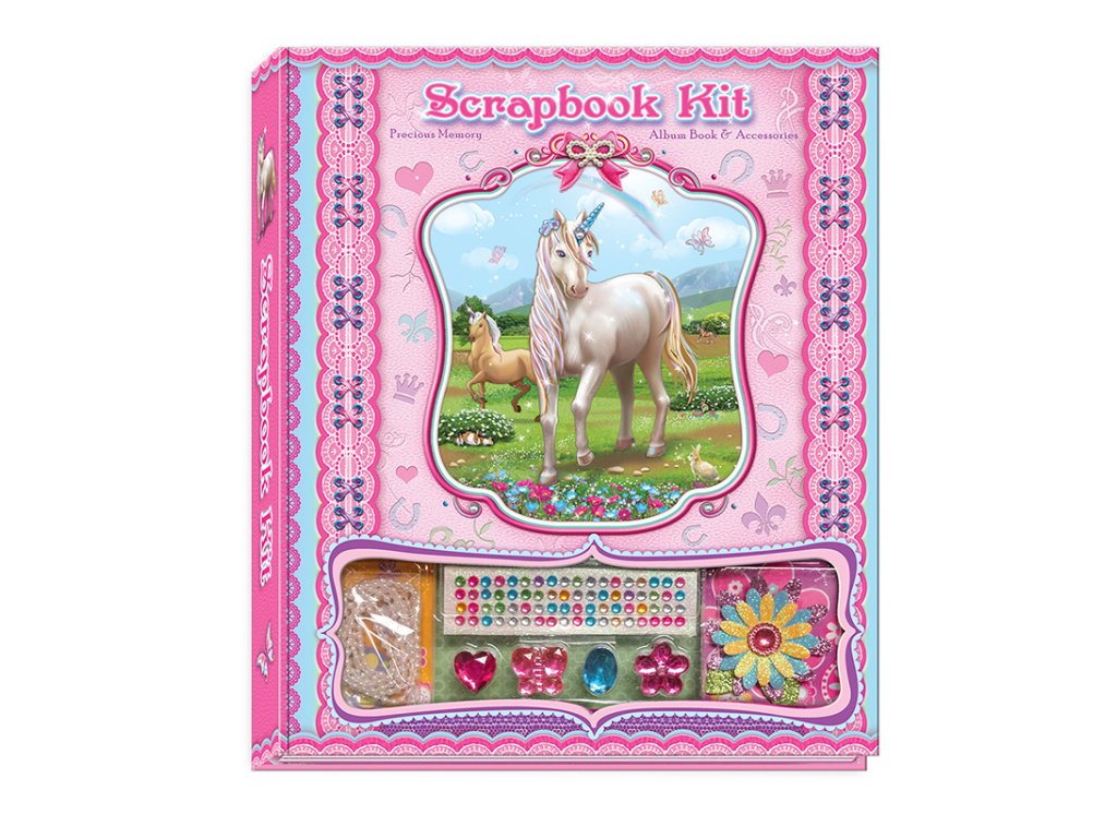 Zápisník s doplňky - jednorožec. Skládá se ze zápisníku, pera a obsahuje různé druhy samolepek 3D.