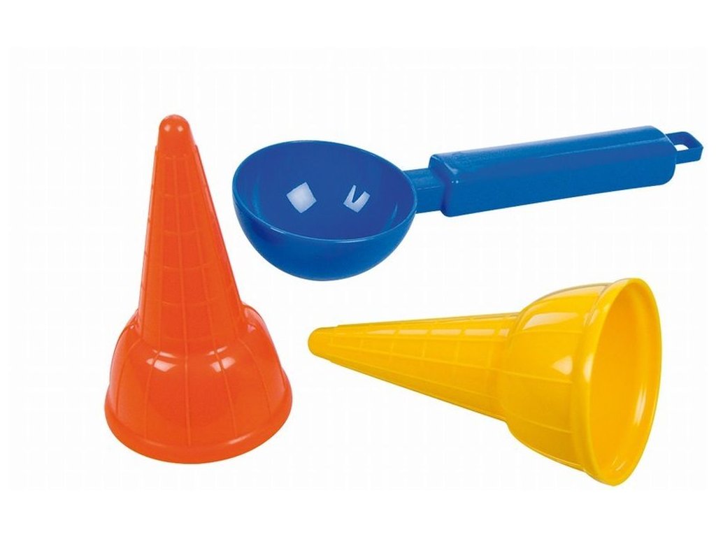 Zmrzlinový set ( 2x kornout, 1x naběračka). Hračky na písek z kvalitního plastu a z české výroby. Zábavné kuchaření na pískovišti nejen pro děvčátka. Věk: 3+ Materiál: plast Počet dílů: 3 Rozměry balení:1 x 6 x 6cm Země původu: ČR