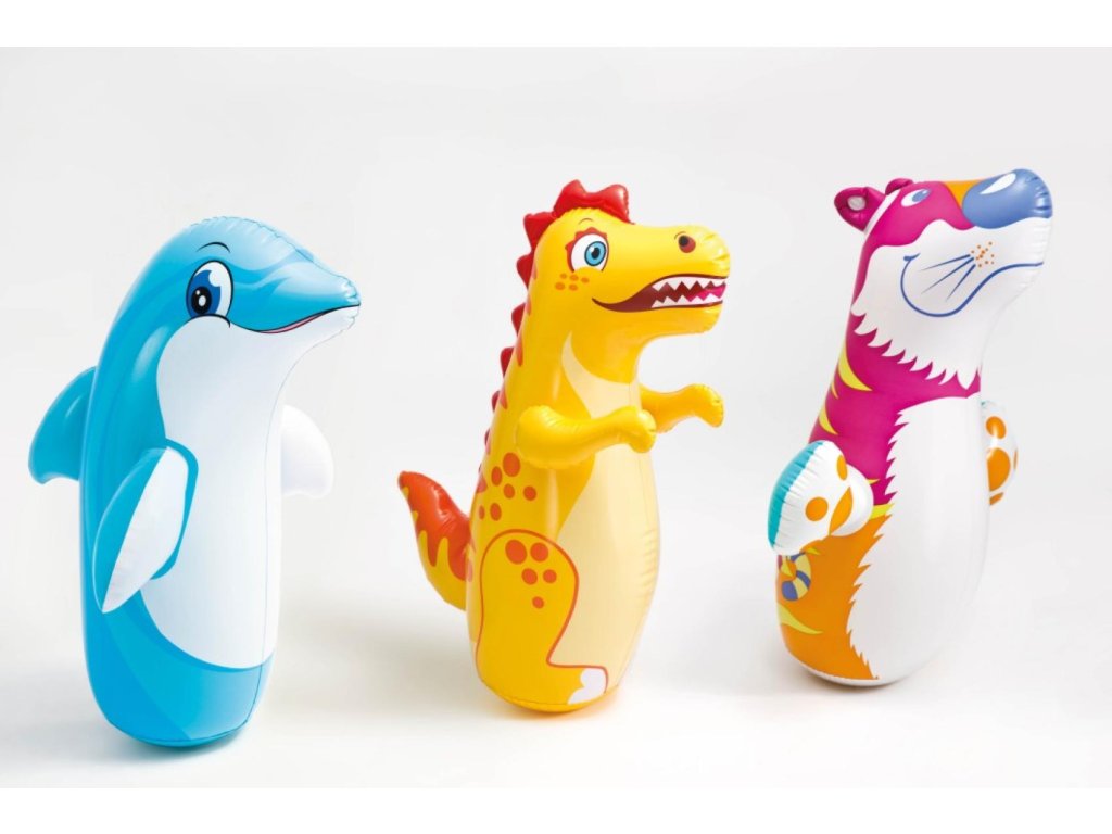 Nafukovací boxovací pytel ve tvaru zvířátka. Hračka obsahuje bezpečnostní ventil a je vyrobena z pevného a předem otestovaného vinylu. V pytli je vestavěná komůrka s pískem, která zajišťuje stabilitu. Určeno pro hraní venku i doma.